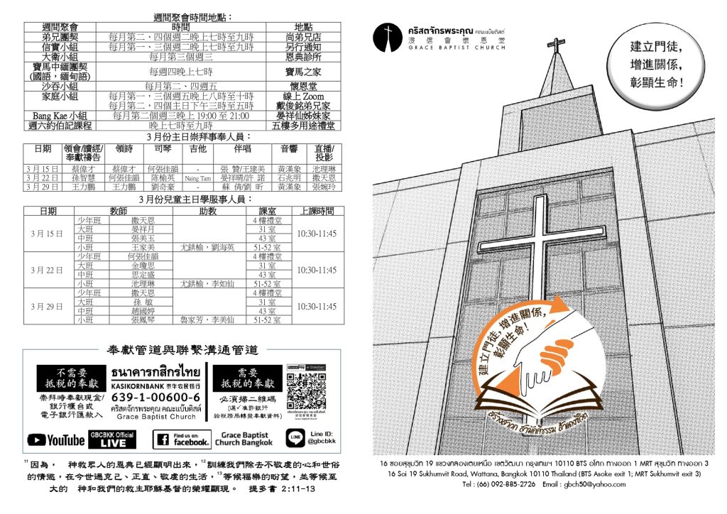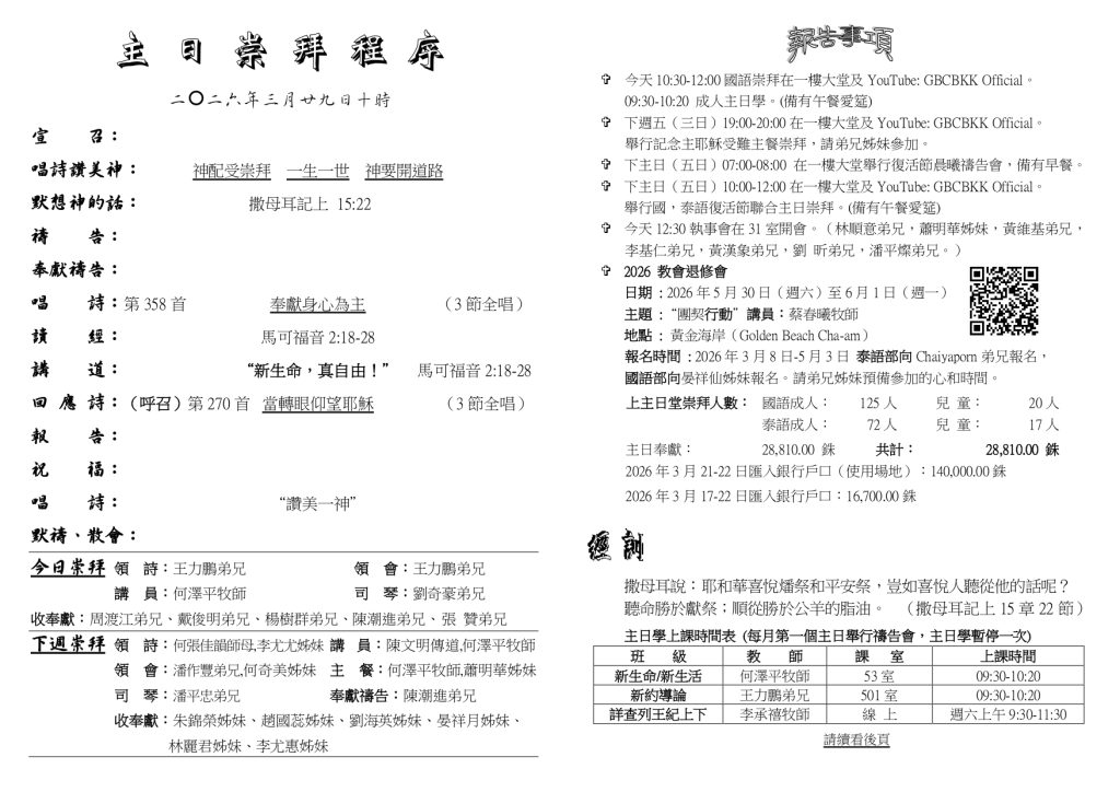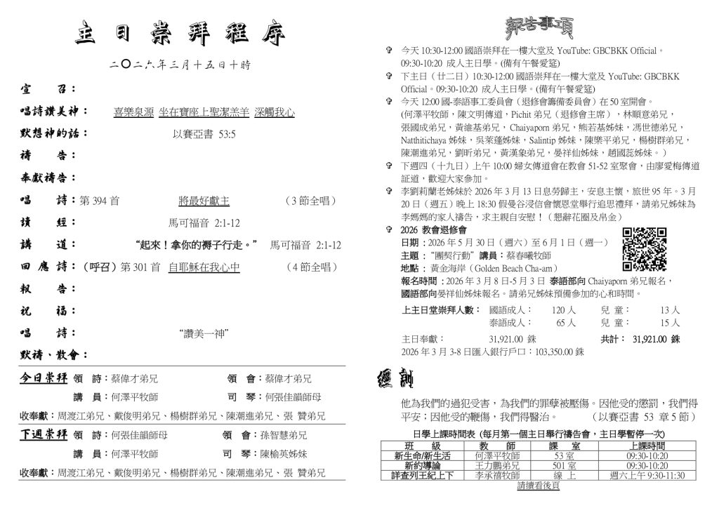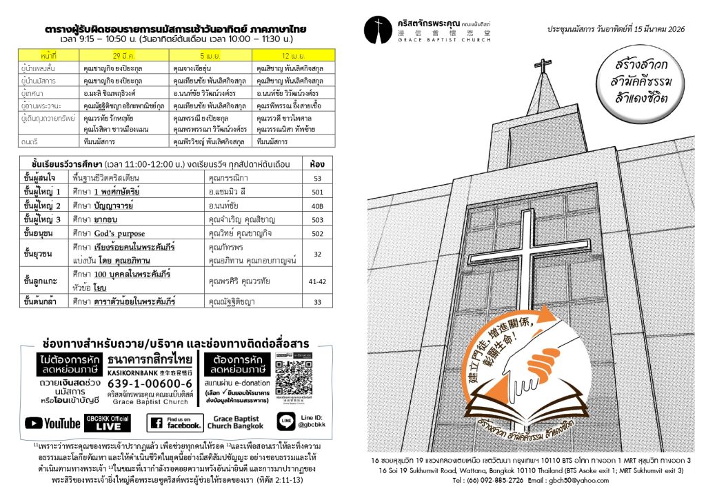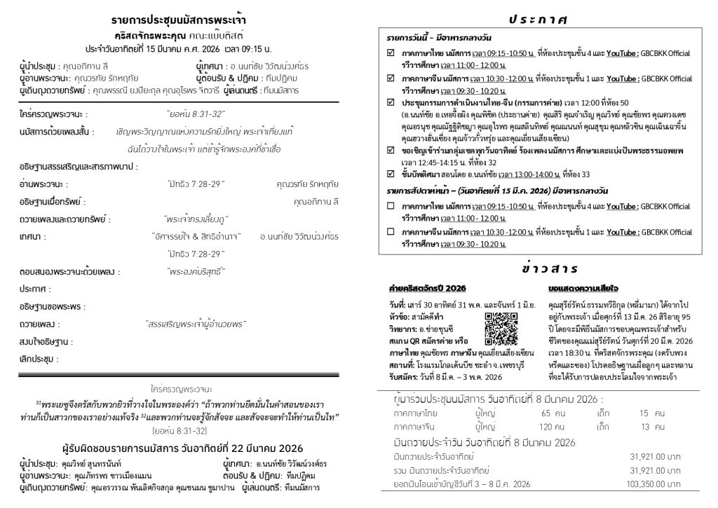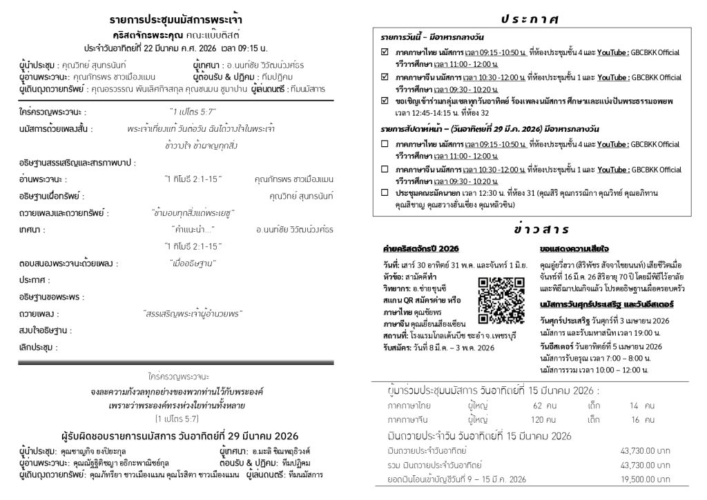 สูจิบัตร : ประชุมนมัสการ วันอาทิตย์ที่ 15 มีนาคม ค.ศ. 2026