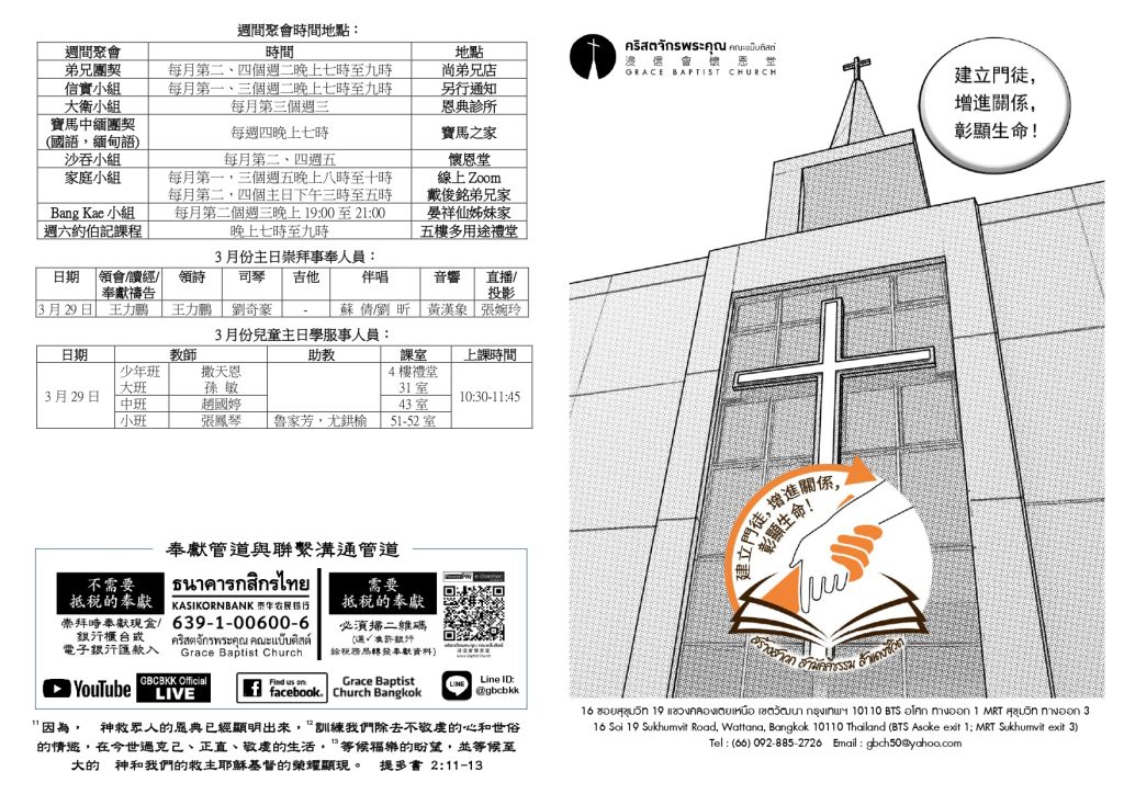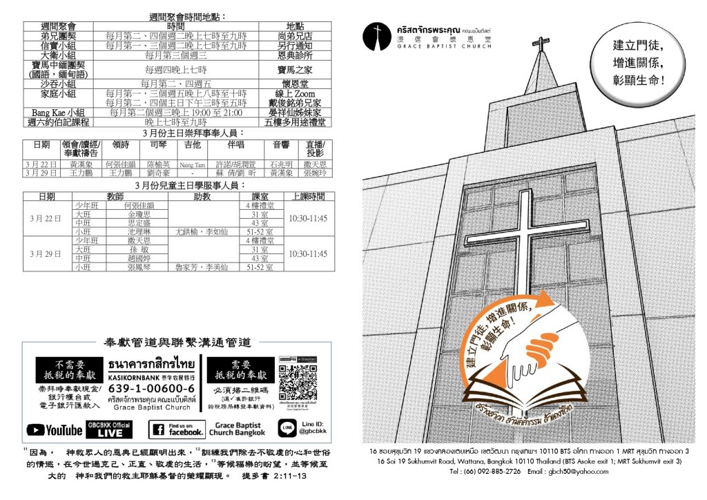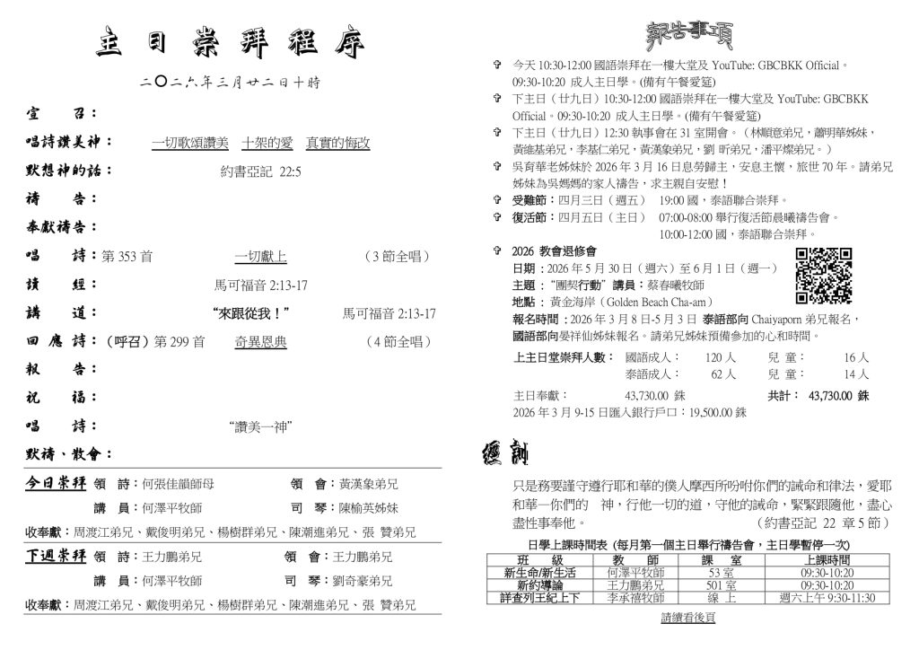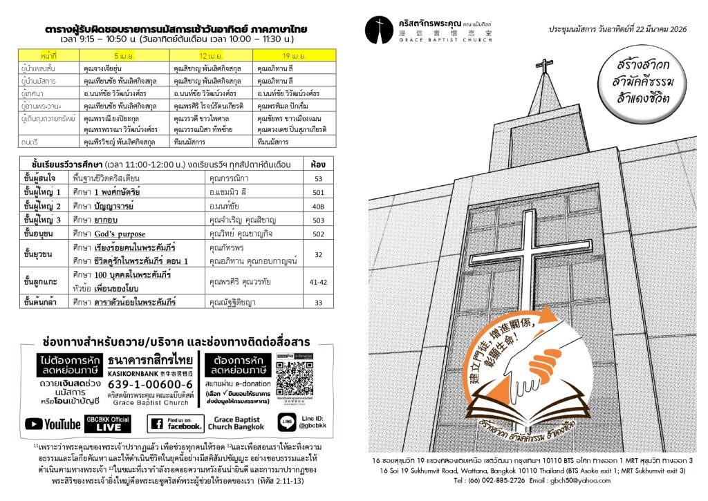 สูจิบัตร : ประชุมนมัสการ วันอาทิตย์ที่ 22 มีนาคม ค.ศ. 2026